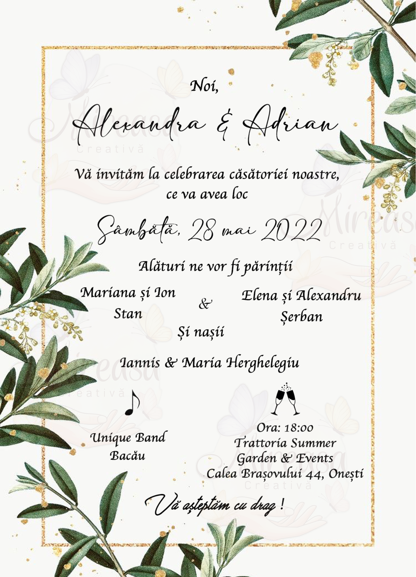 Un model fin, cu flori delicate și un aspect aerisit, potrivit pentru o nuntă liniștită și elegantă. Tonurile soft și detaliile discrete permit o personalizare ușoară, astfel încât invitația să reflecte stilul vostru.