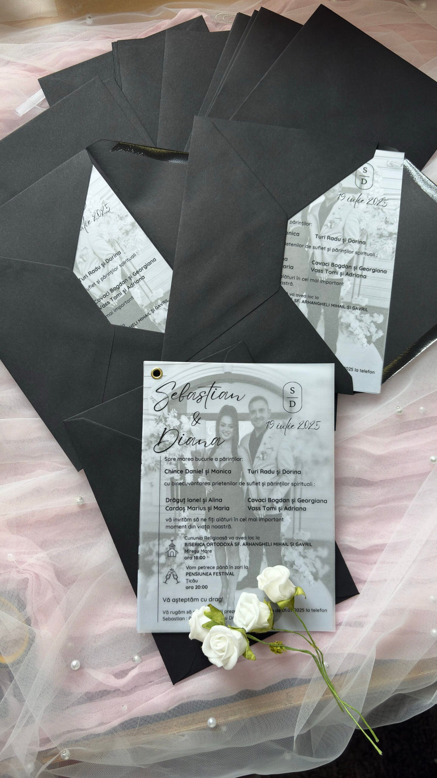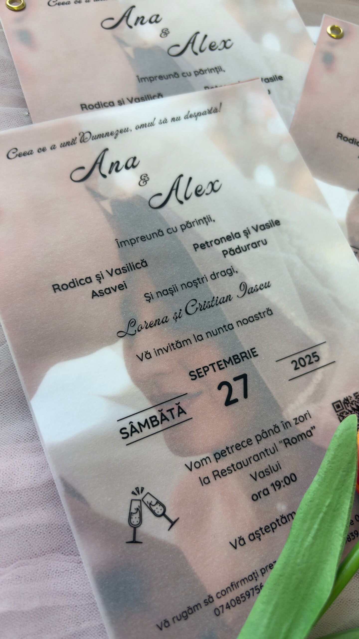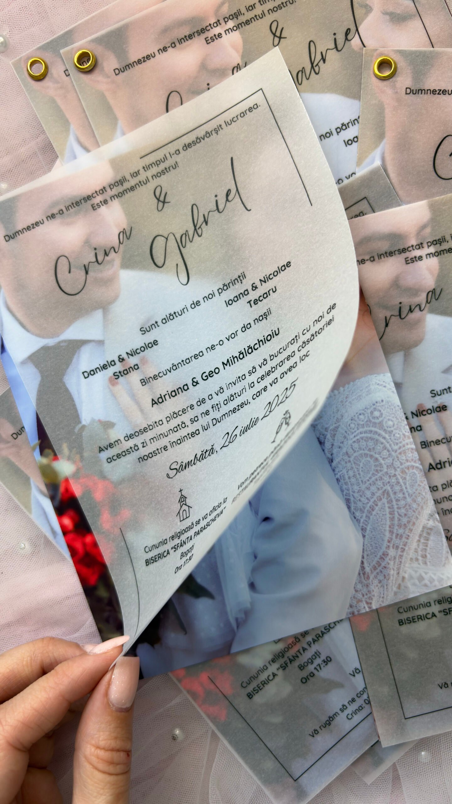 Realizată pe foaie de calc, invitația are o transparență subtilă care creează un efect vizual rafinat.