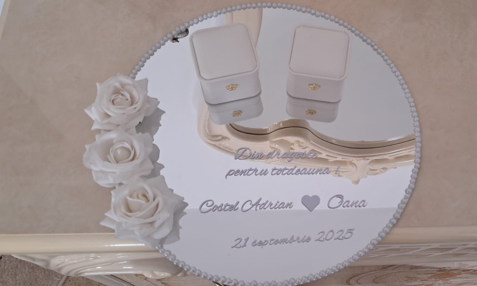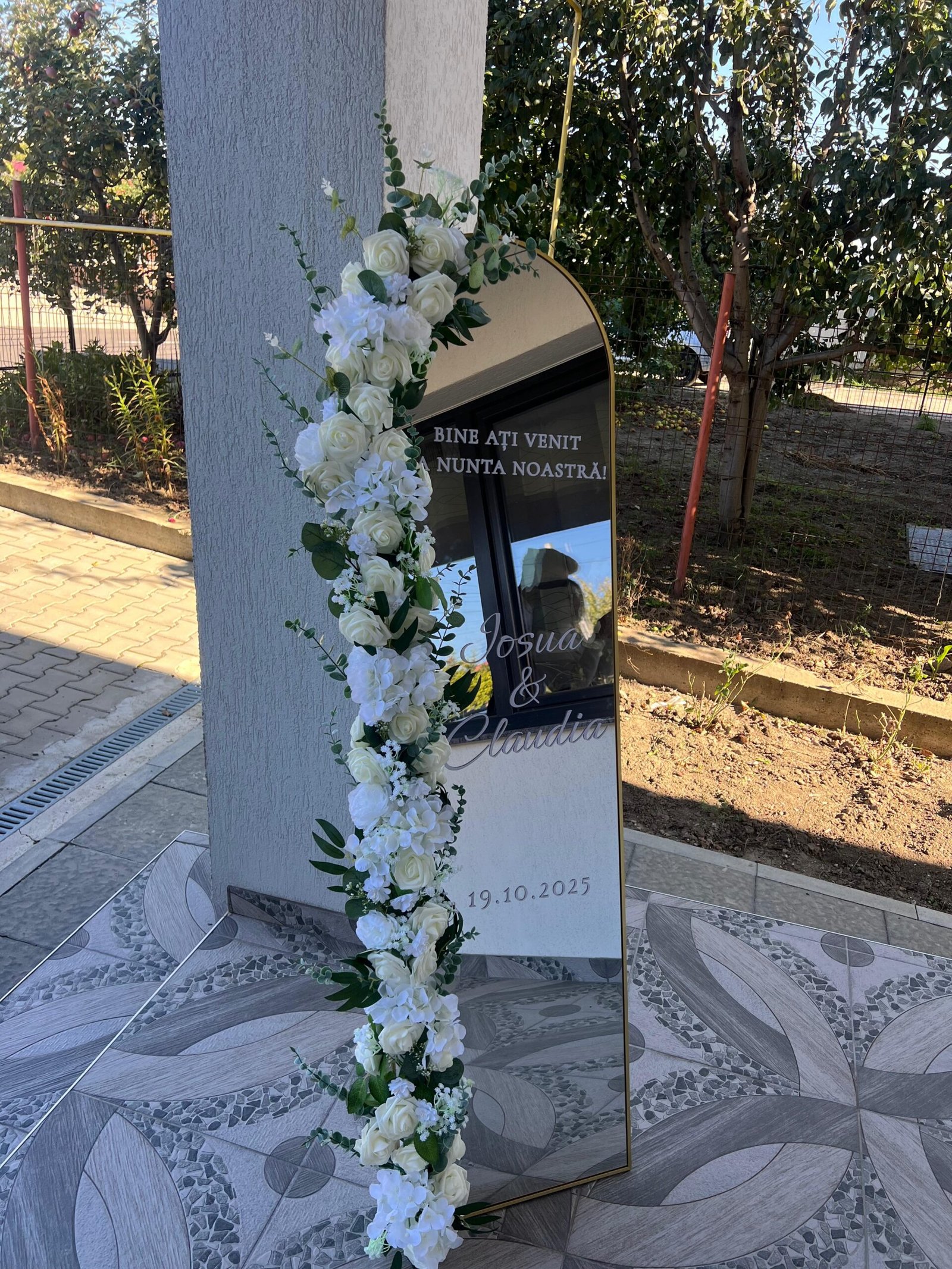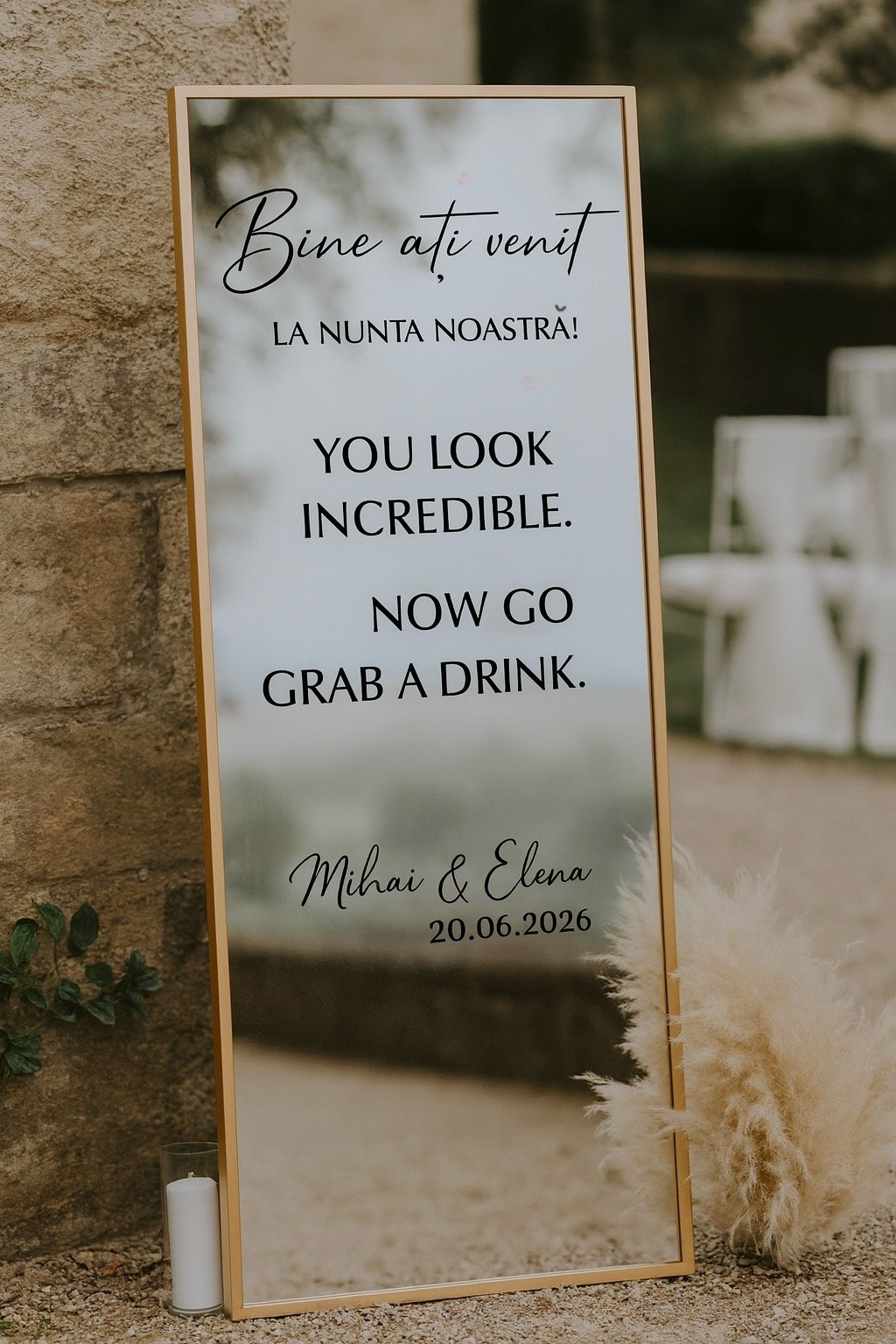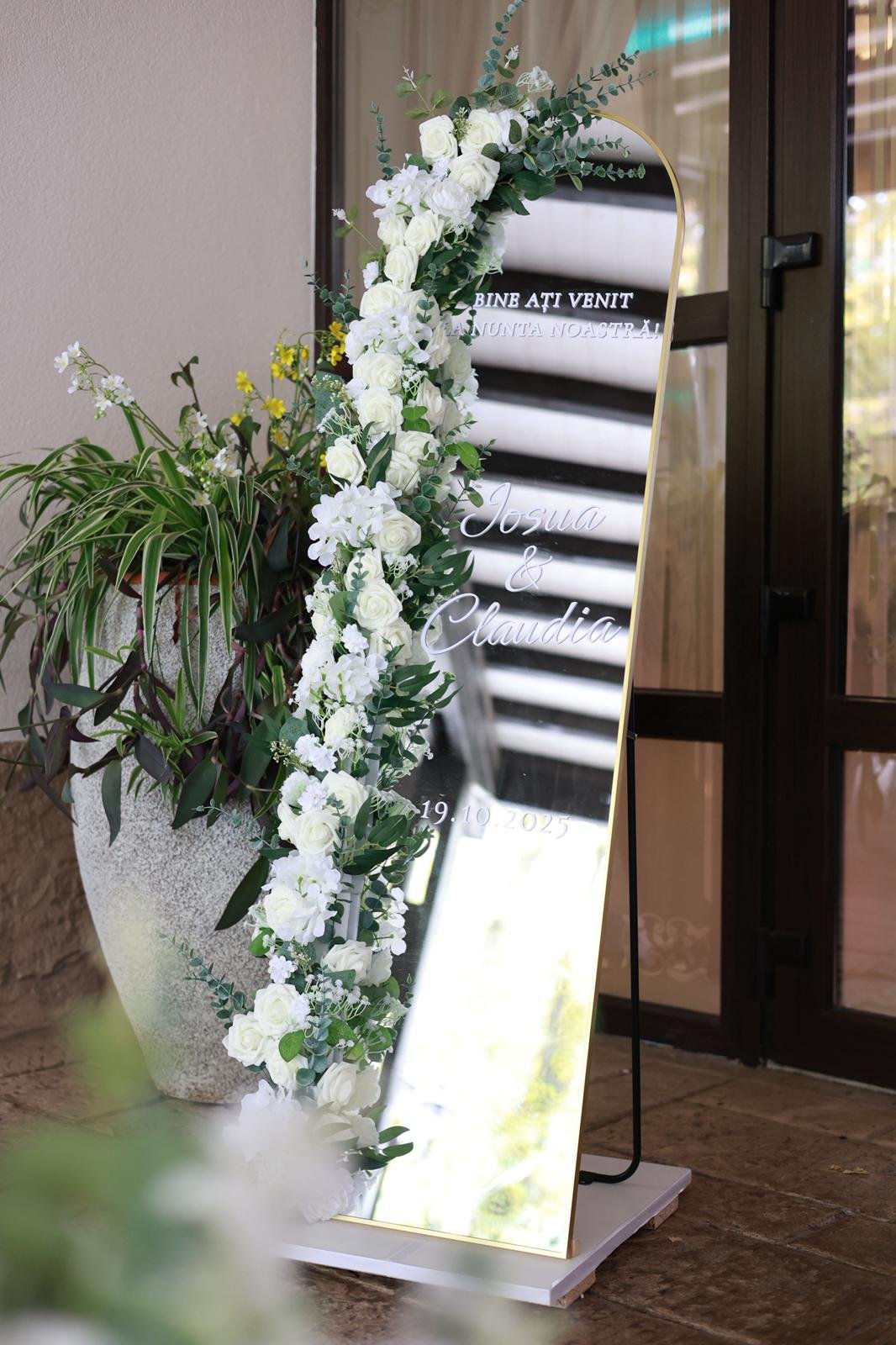💍 Design personalizat & rafinat – Cu numele mirilor și mesaj de întâmpinare pentru un decor memorabil