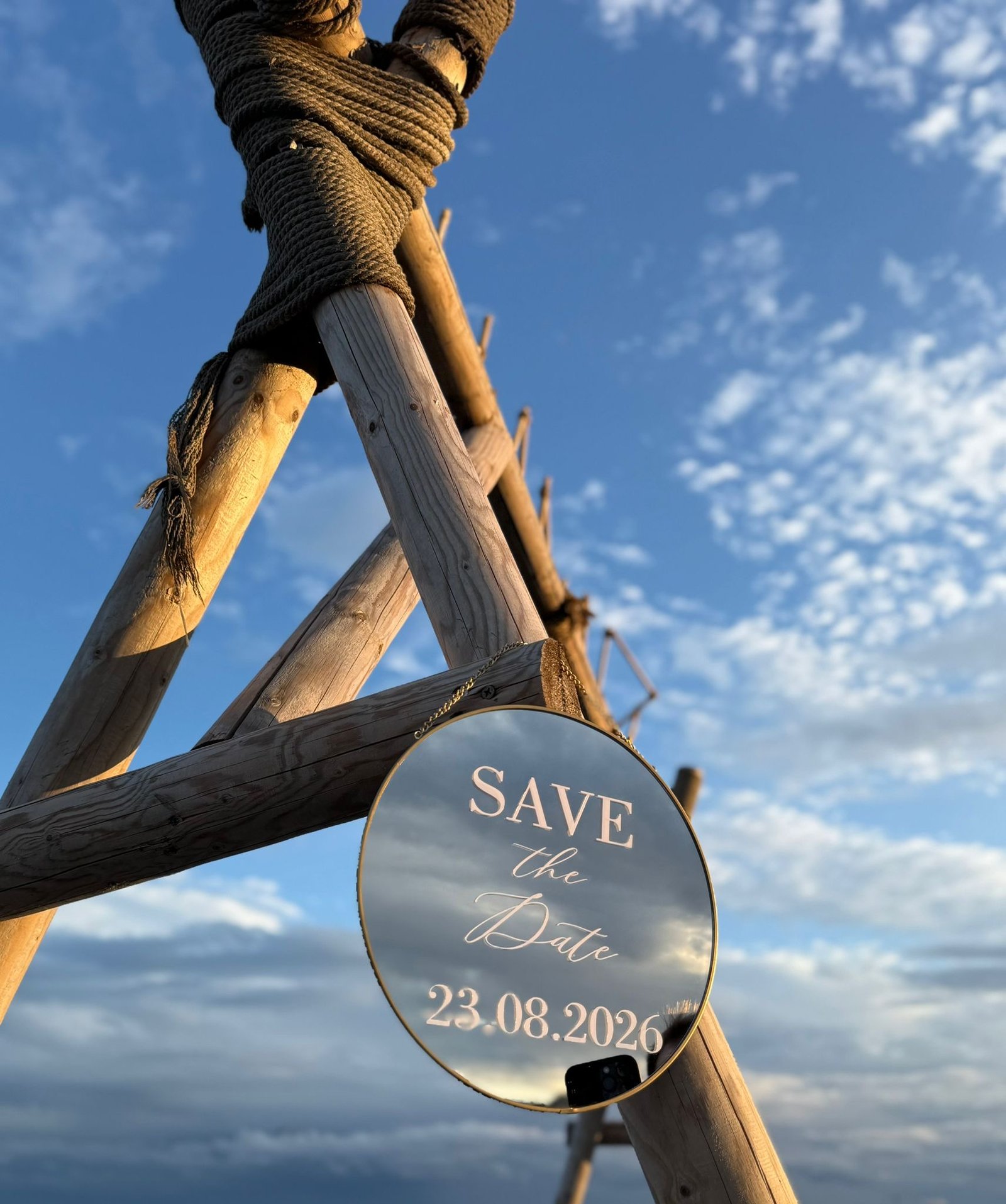 Anunțați ziua cea mare într-un mod elegant și original cu sticker-ul „Save the Date” pentru oglindă! Această idee creativă și modernă transformă orice oglindă într-un anunț memorabil, oferind invitaților un detaliu vizual impresionant.